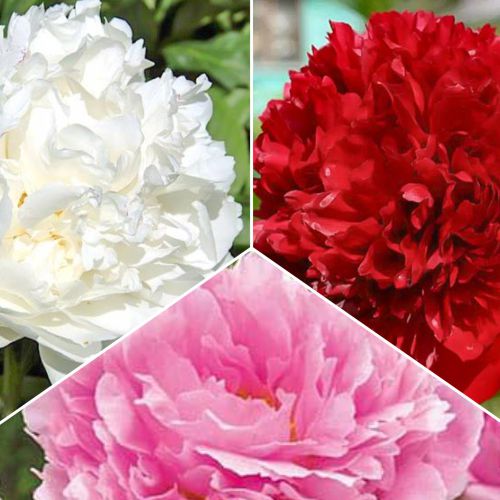 Комплект от 3 разновидности хавлиени божури - Комплектът хавлиени божури е красив комплект, съдържащ 3 разновидности на тези елегантни цветя - розов, червен и бял божур. Розовият божур е ефирен, пастелно розов сорт, един от най-красивите и популярни сортове в нашия магазин. Червеният божур впечатлява с наситения си, силен и привлекателен червен цвят. Освен това има чудесен аромат. Peony White е комбинация от фино и елегантно бяло. Цветовете на тези сортове достигат диаметър от 20 см. При добри почвени и климатични условия тези сортове достигат до 0,8-1 м височина. Цветовете на божура са включени в Супер офертата! Божурът, комплект от 3 сорта, е издръжлив и подходящ за рязане и украса на вази в дома.