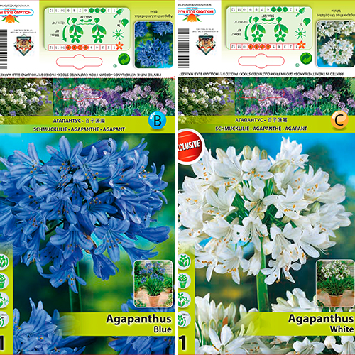 Комплектът от 2 сорта съдържа 2 луковици от атрактивни сортове - син агапантус, бял агапантус. Цветята изглеждат красиво в цветни лехи или като декорация в големи саксии и контейнери на балкони или тераси. Белите агапантуси се отличават с красивите си, елегантни бели камбановидни цветове, а сините агапантуси могат да бъдат разпознати по наситено синия цвят на камбановидните им цветове.